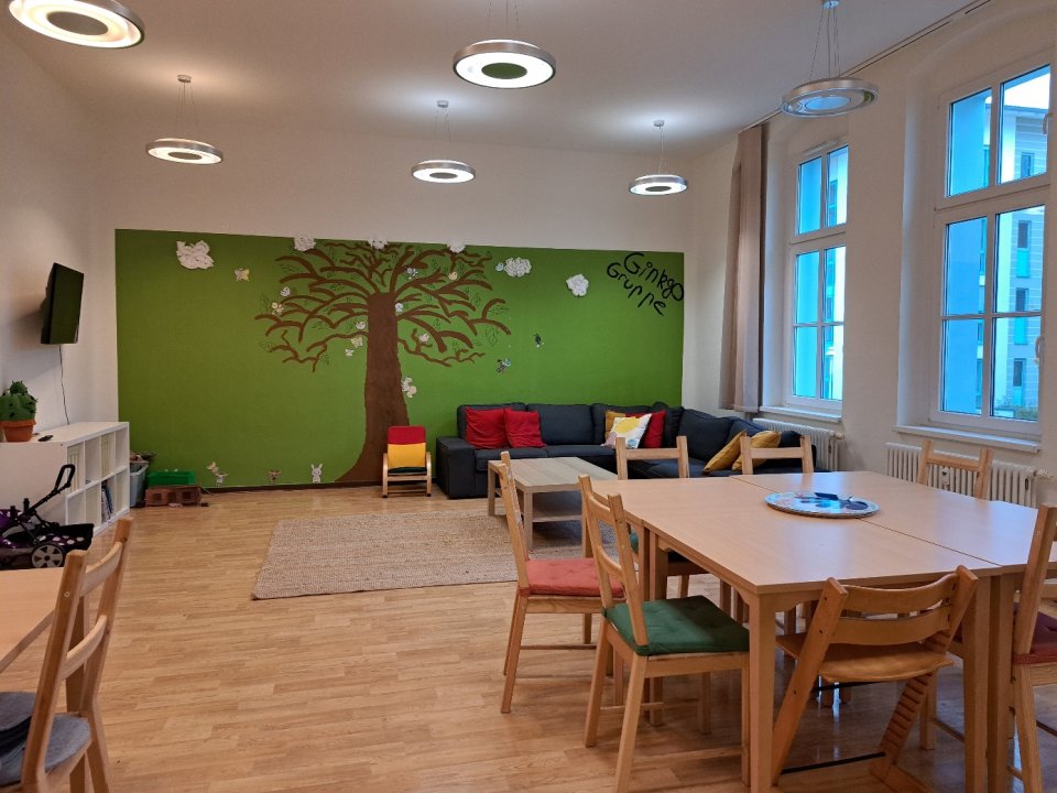 Die Wohngruppe verfügt über insgesamt sechs Plätze. Die Kinder bewohnen Einzel- und ein Doppelzimmer. Ein großzügiger Bereich stellt die Küche mit dem angrenzenden Esszimmer dar, welches gleichzeitig auch als Wohnzimmer genutzt wird.